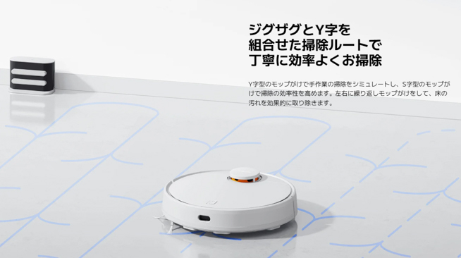 さらに、ジグザグとY字を組み合わせた掃除ルートにより、丁寧に効率よく掃除が行われるとのこと。左右に繰り返しモップがけをして、床の汚れを効果的に取り除くことができると謳っています。