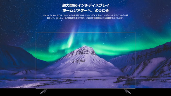 Xiaomi TV Max 86” は、ベゼルレスデザインの86インチスクリーンを備えたチューナーレス・スマートテレビです。